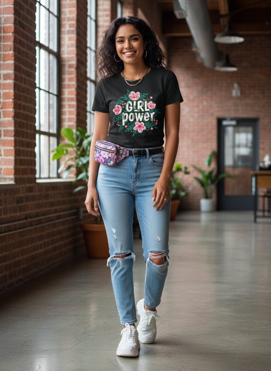 The “Girl Power” tee celebrates the fearless energy of modern women — bold, kind, and powerful all at once. The playful floral design pops beautifully against the deep black base, symbolizing confidence blooming through every challenge.